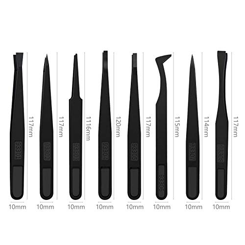 8 modelli: questo set di pinzette antistatiche ha un totale di 8 pinzette di diverse dimensioni, principalmente pinzette a punta, pinzette a gomito e pinzette piatte per soddisfare le vostre esigenze di lavoro.