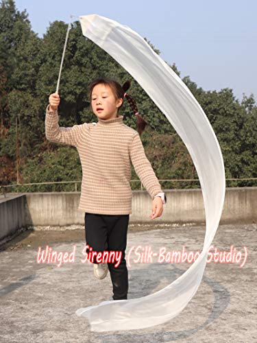 Winged Sirenny Nastro di Seta Bacchetta per Bambini, Streamer Sciarpa in Seta Naturale Dipinta a Mano (180cm Bianco)