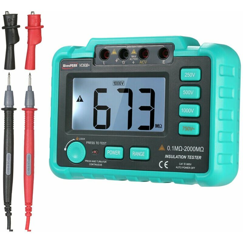 Questo strumento adotta un convertitore di tensione CC dell'induttore di accumulo di energia a bassa perdita e ad alto rapporto per cambiare da 12 V CC a 250 V/500 V/1000 V. Utilizza il ponte digitale LCR per la misurazione della resistenza e il test della resistenza di isolamento. Ha molti vantaggi: leggero, ampio campo di misurazione, display retroilluminato, blocco test, spegnimento automatico e altre funzioni. Può anche essere utilizzato per la misurazione dell'elettricità con aspetto avanzato e prestazioni stabili. Caratteristiche: Ampia gamma di misurazione: fino a 2000 M? 1000 V con una precisione di ± (4% della lettura + 2 cifre). Ampio display LCD (90*48 mm), con retroilluminazione, max. display 1999. Data hold e funzione di spegnimento automatico. Indicazione di over-range: display 1. Basso consumo energetico: meno di 300 mW senza carico misurazione. Applicato nei test di resistenza di isolamento di motori, cavi, apparecchiature elettriche, apparecchiature di