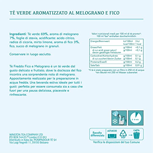 CONTENUTO - A casa riceverai 3 confezioni da 18 filtri di Tè Verde Freddo Fico Melograno Sir Winston Tea. Tè Freddo Fico e Melograno è un tè verde dal gusto delicato e fruttato, dove la dolcezza del fico incontra una sorprendente nota di melograno. Appositamente realizzato per la preparazione in acqua fredda. Una bevanda estiva ideale per tutti i gusti: perfetta per essere consumata sia a casa che fuori per una pausa deliziosa, piacevole e rinfrescante.