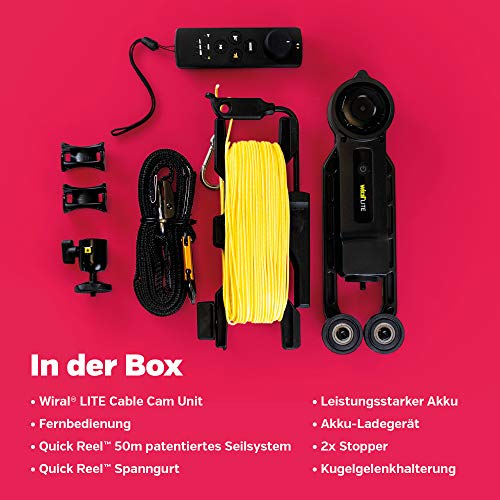 Tutto in uno: il kit include Wiral LITE, telecomando a distanza, bobina Quickreel con corda da 50 metri, cinghia di tensione, batteria, caricatore, supporto per fotocamera con giunto sferico, 2 stopper, istruzioni (lingua italiana non garantita)