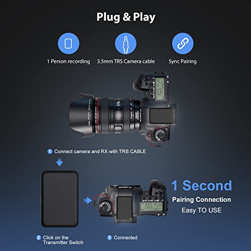 【Facile connessione, Plug & Play】 Collegare il ricevitore alla telecamera tramite il cavo jack da 3,5 mm, accendere l'interruttore del trasmettitore, l'indicatore si accende e la connessione è stabilita. Non c'è bisogno di Bluetooth, non c'è bisogno di APP, basta un secondo perché il trasmettitore e il ricevitore si accoppino automaticamente. Gimpro MB1 (M) aiuta davvero a risparmiare tempo e offre una comoda esperienza di lavoro.