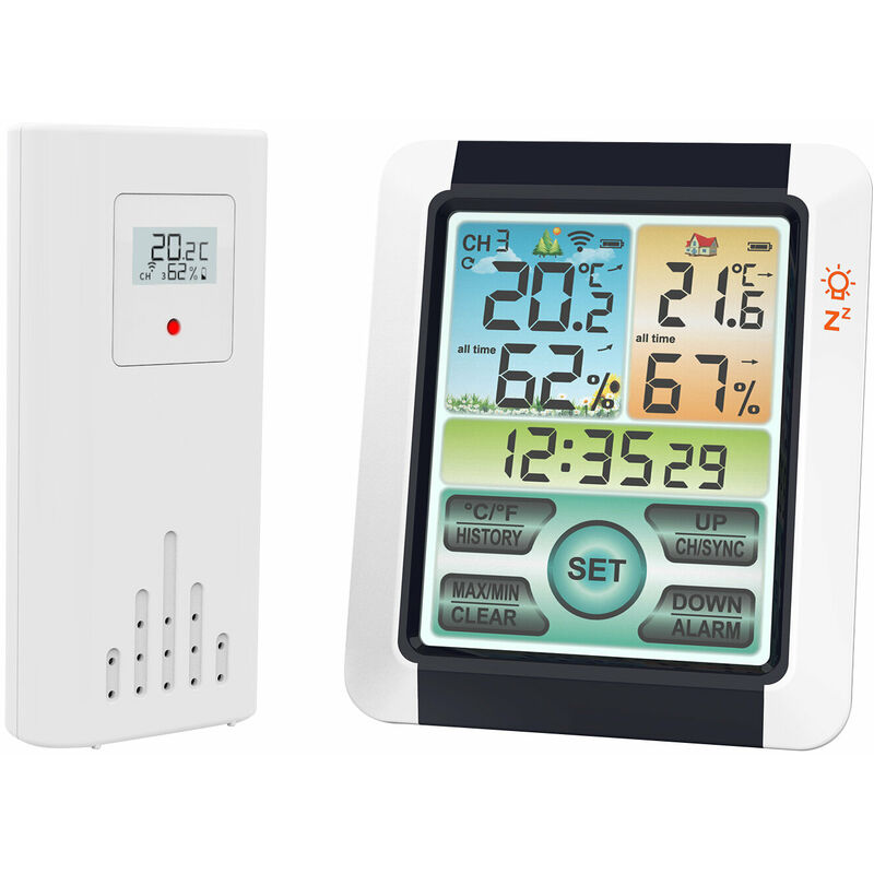 design touchscreen sensibile, facile da regolare. [Alimentazione a batteria] P alimentato da 3 batterie AAA e 2 batterie AA (non incluse), veloce da usare necessità di ricarica frequente, basso consumo energetico, ha un lungo tempo di lavoro. [Facile da installare] Con fori per appendere sul retro, supporto da scrivania, design magnetico e tappetini adesivi, sia il monitor del display che il sensore esterno sono facili e flessibili da installare. Specifiche: Colore: nero e nero bianco Materiale: ABS Intervallo di temperatura interna: -4°F -- 158°F (-20°C--70°C) Intervallo di