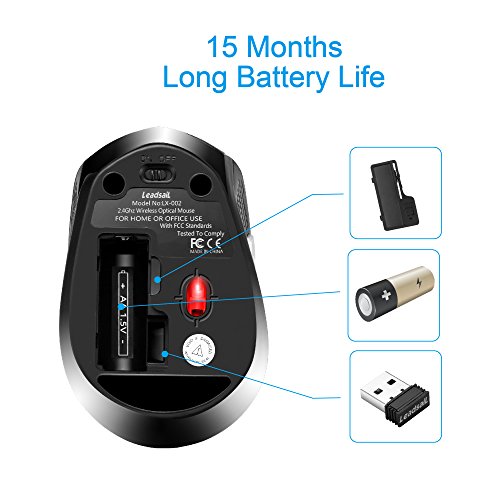 【Semplice Utilizzo e Ampia Compatibilità】 Avvio immediato, senza il bisogno di software o firmware addizionali.Il mouse wireless LeadsaiL lavorà con sistemi Windows2000/ME/7/8/10/XP, Mac, Linux, Vista e altri computer con interfaccia USB.È adatto per Notebook, PC Personali, Laptop, Computer, Macbook.Nota bene: i pulsanti laterali non sono disponibili sotto sistemi Mac OS, le altre funzioni possono essere normalmente utilizzati.