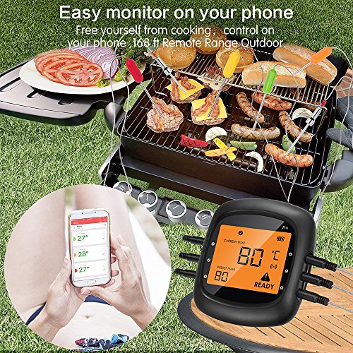 Connessione senza fili Bluetooth - ultra-lunga distanza Bluetooth (30,5 m all' interno, 51,8 m all' aperto, che può variare a seconda dell' ambiente circostante) e super basso consumo energetico. Facile da monitorare e controllare dal vostro dispositivo iOS o Android tramite App "easybbq." Un tono di allarme verrà segnalato dalla App quando il cibo è fatto, e si può osservare la temperatura curve anche con l' app. Ti permette di essere liberato dal controllo il processo di cottura. Puoi fare qualsiasi altro durante la cottura.