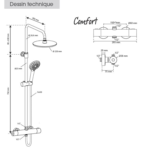 Wirquin 60723470 - Colonna doccia con miscelatore termostatico Bergamo Comfort a 3 getti, cromato