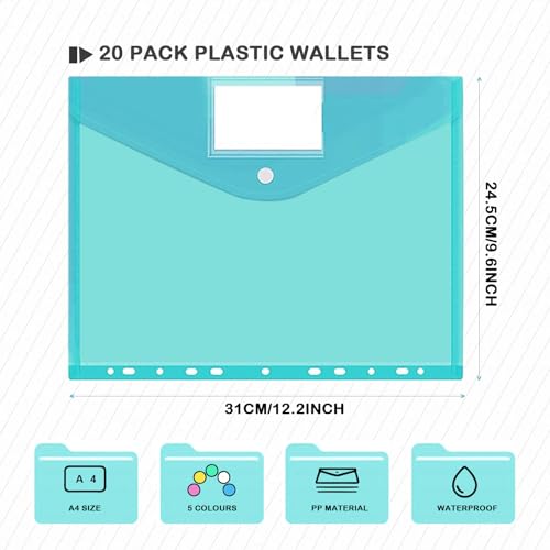 WIRSHO 20 pcs Buste Trasparenti A4 con Fori per Raccoglitore, Busta Plastica con Bottone et Etichette, Cartelline Trasparenti Colorate per Porta Documenti Scuola e Ufficio, 4 Colori