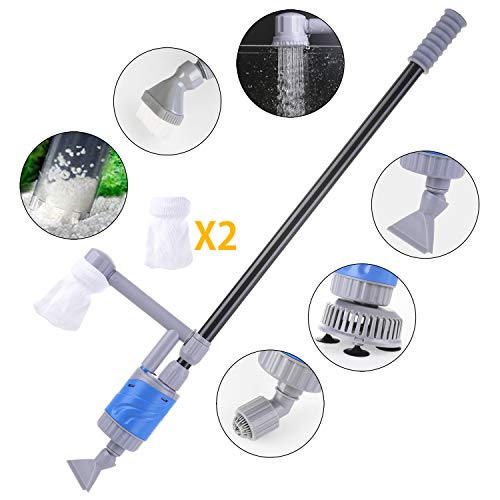Potente funzione di pulizia 6 in 1: può essere utilizzato per pulire la ghiaia, assorbire lo sporco, cambiare acqua, lavare la sabbia e aspirare lo sgabello. Forte potenza con aspirazione sufficiente per cambiare acqua, succhiare residui di cibo e escrementi di pesce fuori dall'acquario rapidamente.