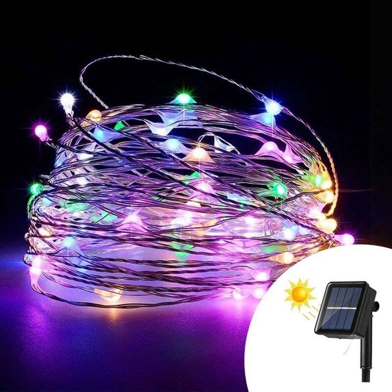 Stringa microled ad energia solare da esterno IP65 per illuminare giardini, alberi di Natale, presepi e decorazioni natalizie, filo di colore argento, 100 Miniled diametro 5mm distanti 10 cm l'uno dall'altro, Multicolore, controller con 8 giochi di luci, lunghezza 10 metri, il pannello solare durante il giorno ricarica la batteria interna che è in grado di fornire l'energia necessaria a garantire l'illuminazione per l'intera durata della notte.