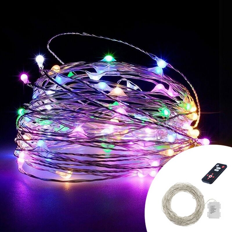 MicroLed impermeabili per presepi, bottiglie, vasi, caminetti, alberi di natale ed ogni tipo di decorazione che si voglia illuminare o che non sia raggiungibile da corrente elettrica, filo di colore argento, 150 Microled diametro 1,5mm distanti 10 cm l'uno dall'altro, Multicolore, alimentato da 3 batterie AA non incluse con telecomando, con 8 giochi luminosi, lunghezza 15 metri, per uso interno con possibilità di uso esterno solo se il controller non è direttamente esposti ad agenti atmosferici.
