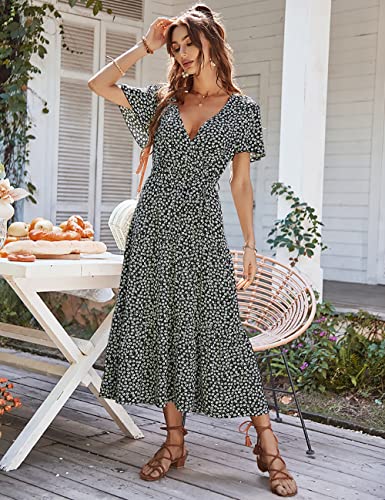 WISFRUIT Abito estivo da donna, casual, con scollo a V, motivo floreale, boho, a maniche corte, con volant, elegante motivo floreale, abito da spiaggia con fascia in vita, A-nero., XL