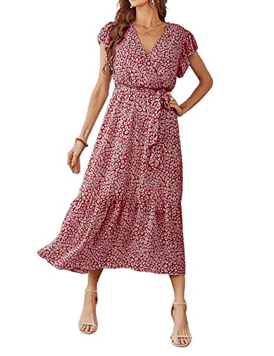 WISFRUIT Maxi abito estivo floreale casual da donna avvolgente scollo a V manica corta svolazzante una linea Boho Flowy cintura abiti, B-rosso, S