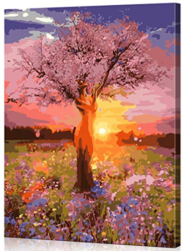 WISKALON Dipingere con i Numeri Animali per Adulti e Bambini DIY Dipinto ad Olio con i Numeri Kit su Tela Acrilici Dipingere e Pennelli - Albero del Tramonto 16x20 Pollici (con Cornice in Legno)