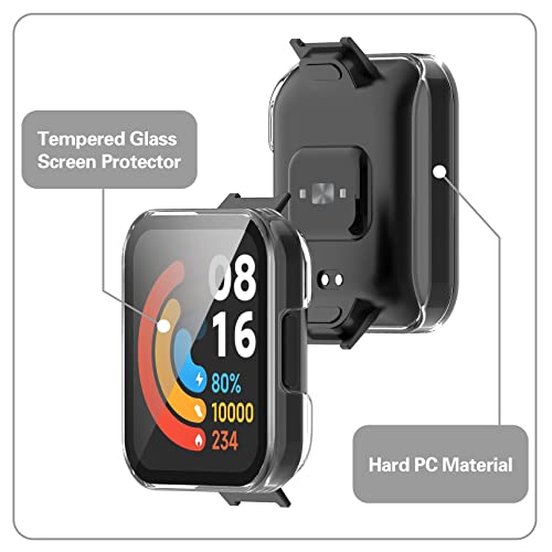 [Custodia rigida in PC con protezione dello schermo in vetro temperato]: custodia rigida in PC integrata in vetro temperato trasparente ultrasottile (che non ha il problema di tocco), copre sia lo schermo che i bordi, protegge a 360 gradi il tuo Xiaomi Redmi Watch Lite 2 da graffi, urti e cadute accidentali.