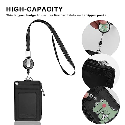 WJUAN Porta Badge in PU, 5 Scomparti per Carte e 1 Tasca con Cerniera, Iunghezza Totale 57 cm, Porta Badge Doppio Lato con Fibbia a Scomparsa, Nero Stile Cartone Animato