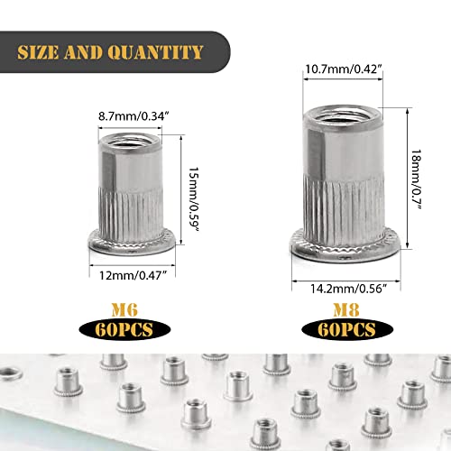 Contenuto della confezione: la confezione contiene 120 dadi filettati M6 M8, la quantità è sufficiente per soddisfare le tue esigenze quotidiane. M6 x 60 pezzi, M8 x 60 pezzi.