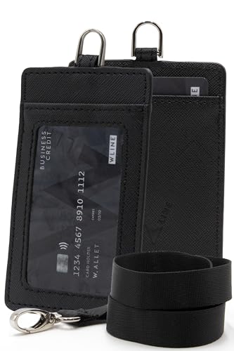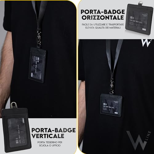WLine Porta Badge da Collo in Pelle PU Saffiano - Portabadge con Taschino Trasparente Anteriore (Nero Saffiano Verticale)