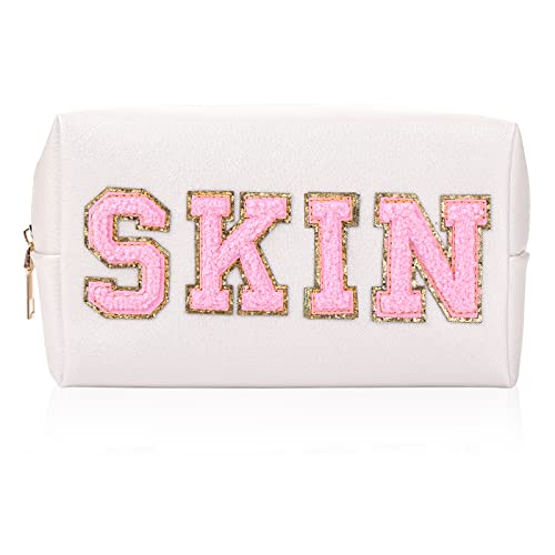 WLLHYF Borsa Trucco Preppy Pelle Lettere Toppa Borsa Cosmetica Borsa Portatile con Cerniera Cura della Pelle Cosmetica Borsa da Viaggio Borsa portaoggetti Organizer Accessori per Donne Ragazze