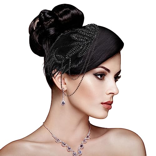 WLLHYF Fasce per capelli anni '20, con piume, stile vintage, con strass e perline di cristallo, accessori per capelli per donne e ragazze (catena, diamante nero)