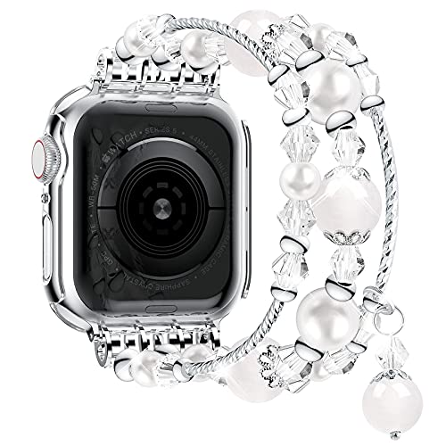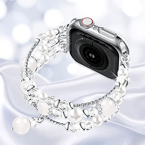 Wlooo Cinturino per Apple Watch 38 mm 40 mm 42mm 44mm, Donna Ragazza Elastico Cristallo Perla Cinturini di Ricambio Cinturino & Glitter Diamond Cover per Serie iWatch 6 SE 5 4 3 2 1 (Argento, 44mm)