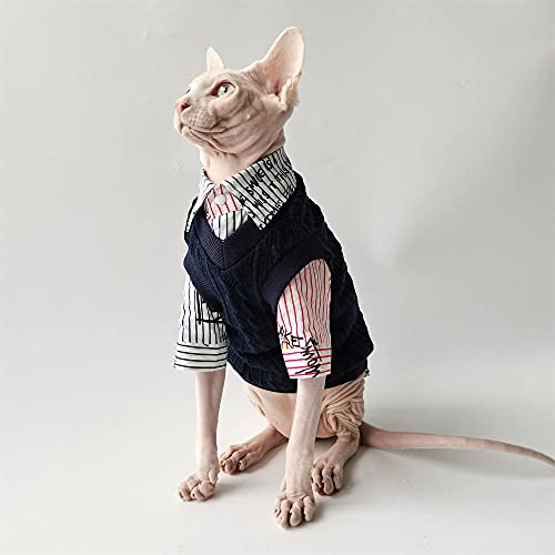 WMXING Vestito da Gatto Gilet a Maglia a V e Una Camicia a Contrasto, Adatta per Sphynx e Altri Gatti dei Capelli-Camicia Blu Scuro +_L.