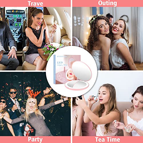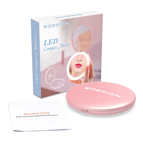 Wobsion Mini Led Specchietto da Borsetta,LED Specchio Piccolo Specchio 10x Con Luce,3.5 Pollici,Specchietto da Borsa,Specchio Portatile,Regalo per Ragazza,Compatto Pieghevole,Specchio da Viaggio,Rosa
