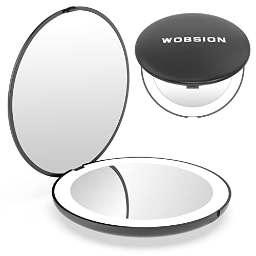 Wobsion Mini Led Specchietto da Borsetta,LED Specchio Piccolo Specchio 10x con Luce,3.5 Pollici,Specchietto da Borsa,Specchio Portatile,Regalo Per Ragazza,Compatto Pieghevole,Specchio da Viaggio,Black