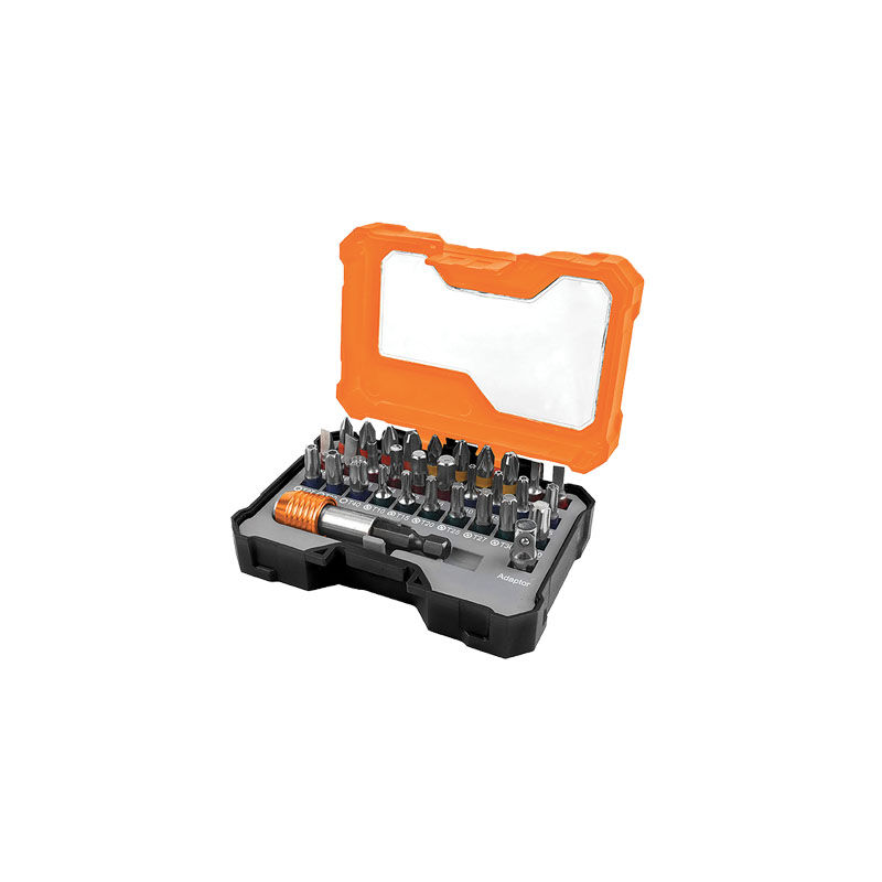 Composto da 1 portainserto magnetico 1/4″xMm. 65, 30 inserti 1/4”xMm. 25 in acciaio S2: PH1, PH2, PH2, PH3, PZ1, PZ2, PZ2, PZ3, TA3, TA4, TA5, TA6, HEX3, HEX4, HEX5, HEX6, T10, T15, T20, T25, T27, T30, T40, TX10, TX15, TX20, TX25, TX27, TX30 e TX40. 1 adattatore 1/4″xMm. 25. In pratico box plastico. In blister.