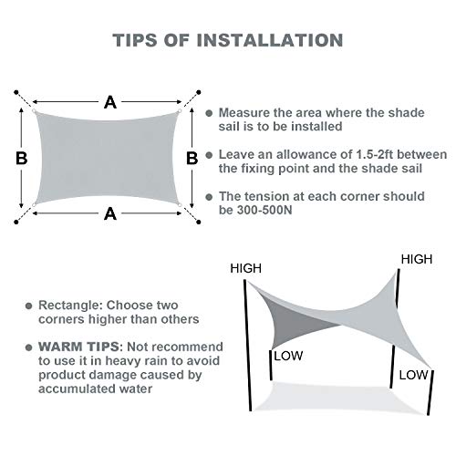 Installazione Semplice: puoi appendere rapidamente la vela ombreggiante su alberi, pareti e pali alti, ogni angolo ha un anello a D in acciaio inossidabile 304, di circa 3cm di diametro, e dotato di corde antivento, 1,5m ciascuna. Puoi anche attaccare la vela solare ad altri accessori come golfari, tenditori e moschettoni. Ti consigliamo inoltre di tenere la vela tesa a circa il 20-25% di pendenza in modo che l'acqua non si accumuli e scorra via in qualsiasi momento