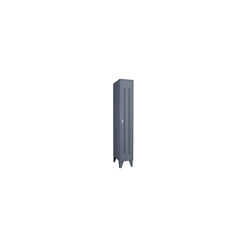 Armadietto in acciaio con piedini, scomparti a tutta altezza, ante forate, larghezza scomparto 300 mm, 1 scomparto, grigio-azzurro. Fornitura = montato. Altezza = 1850 mm. Profondità = 500 mm. Larghezza = 300 mm. Colore corpo = grigioazzurro RAL 7031. Colore porta = grigioazzurro RAL 7031. Serratura = chiavistello girevole. Numero scomparti in larghezza = 1 pz. Larghezza scomparti = 300 mm. Materiale = lamiera d'acciaio. Altezza armadietto = 1850 mm. Dotazione interna = 1 cappelliera, 1 asta appendiabiti, 3 ganci scorrevoli. Larghezza interna = 298 mm. Altezza interna = 300 / 1400 mm. Profondità interna = 475 mm. Tipo di porta = ante forate. Altezza piedini = 150 mm. Struttura = saldata. Superficie = con verniciatura a forno. Robusto armadietto con piedini a norma DIN 4547. Disponibili in varie larghezze e colori. A scelta con ante forate o piene con battuta a destra. Dotazione interna personalizzabile. Fessure di aerazione per una circolazione ottimale dell'aria. Bordo con doppia