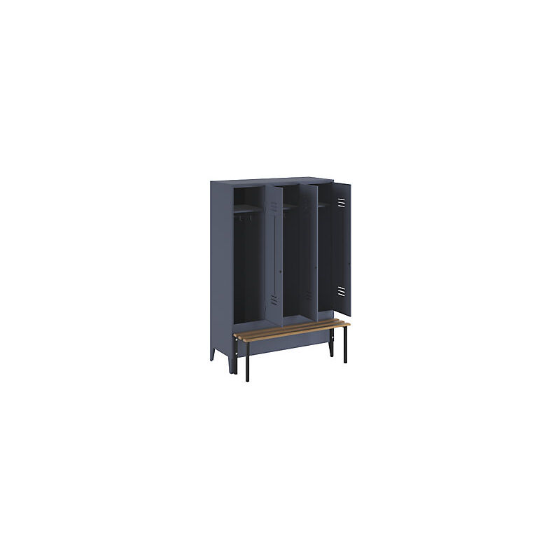 Armadietto guardaroba con panca anteriore, ante piene, larghezza scomparti 400 mm, 3 scomparti, grigio-azzurro. Fornitura = montato. Altezza = 1850 mm. Larghezza = 1200 mm. Profondità = 805 mm. Colore corpo = grigioazzurro RAL 7031. Colore porta = grigioazzurro RAL 7031. Serratura = chiavistello girevole. Numero scomparti in larghezza = 3 pz. Materiale = lamiera d'acciaio. Larghezza scomparti = 400 mm. Profondità scomparti = 500 mm. Dotazione interna = 1 cappelliera, 1 asta appendiabiti con 4 ganci. Altezza sedile = 415 mm. Profondità sedile = 300 mm. Altezza piedini = 150 mm. Altezza armadio = 1850 mm. Profondità armadio = 500 mm. Tipo di porta = ante piene. Colore doghe = faggio. Colore telaio = nero notte RAL 9005. Serie = BERLIN. Larghezza interna = 398 mm. Altezza interna = 250 / 1420 mm. In robusta lamiera d'acciaio saldata, con rinforzo. Con panca anteriore e ante ridotte. Chiavistello girevole predisposto per lucchetto (diametro staffa 6 - 8 mm max). Portatarghette, alt. x