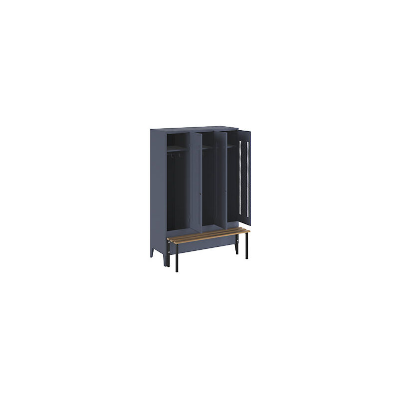 Armadietto guardaroba con panca anteriore, ante in lamiera forata, larghezza scomparti 400 mm, 3 scomparti, grigio-azzurro. Fornitura = montato. Altezza = 1850 mm. Larghezza = 1200 mm. Profondità = 805 mm. Colore corpo = grigioazzurro RAL 7031. Colore porta = grigioazzurro RAL 7031. Serratura = chiavistello girevole. Numero scomparti in larghezza = 3 pz. Materiale = lamiera d'acciaio. Larghezza scomparti = 400 mm. Profondità scomparti = 500 mm. Dotazione interna = 1 cappelliera, 1 asta appendiabiti con 4 ganci. Altezza sedile = 415 mm. Profondità sedile = 300 mm. Altezza piedini = 150 mm. Altezza armadio = 1850 mm. Profondità armadio = 500 mm. Tipo di porta = ante forate. Colore doghe = faggio. Colore telaio = nero notte RAL 9005. Serie = BERLIN. Larghezza interna = 398 mm. Altezza interna = 250 / 1420 mm. In robusta lamiera d'acciaio saldata, con rinforzo. Con panca anteriore e ante ridotte. Chiavistello girevole predisposto per lucchetto (diametro staffa 6 - 8 mm max).