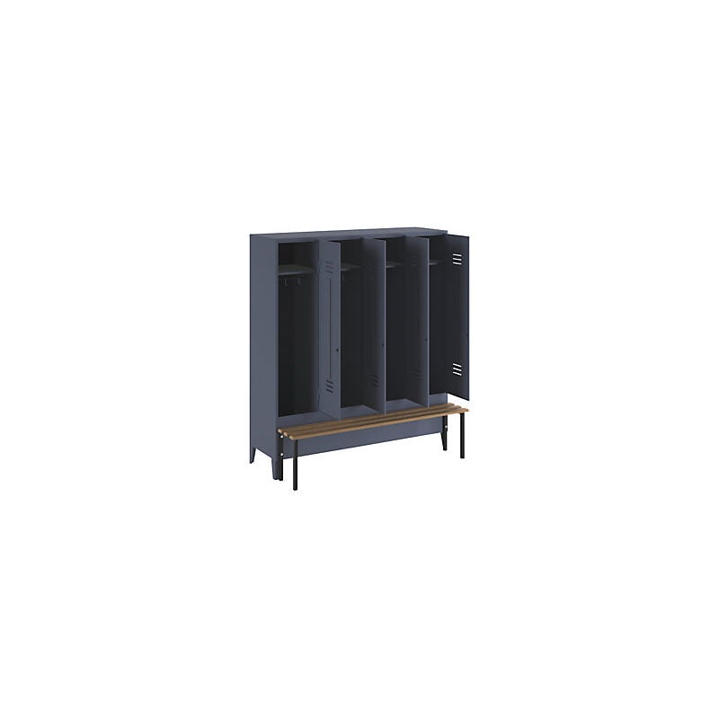 Armadietto guardaroba con panca anteriore, ante piene, larghezza scomparti 400 mm, 4 scomparti, grigio-azzurro. Fornitura = montato. Altezza = 1850 mm. Larghezza = 1600 mm. Profondità = 805 mm. Colore corpo = grigioazzurro RAL 7031. Colore porta = grigioazzurro RAL 7031. Serratura = chiavistello girevole. Numero scomparti in larghezza = 4 pz. Materiale = lamiera d'acciaio. Larghezza scomparti = 400 mm. Profondità scomparti = 500 mm. Dotazione interna = 1 cappelliera, 1 asta appendiabiti con 4 ganci. Altezza sedile = 415 mm. Profondità sedile = 300 mm. Altezza piedini = 150 mm. Altezza armadio = 1850 mm. Profondità armadio = 500 mm. Tipo di porta = ante piene. Colore doghe = faggio. Colore telaio = nero notte RAL 9005. Serie = BERLIN. Larghezza interna = 398 mm. Altezza interna = 250 / 1420 mm. In robusta lamiera d'acciaio saldata, con rinforzo. Con panca anteriore e ante ridotte. Chiavistello girevole predisposto per lucchetto (diametro staffa 6 - 8 mm max). Portatarghette, alt. x