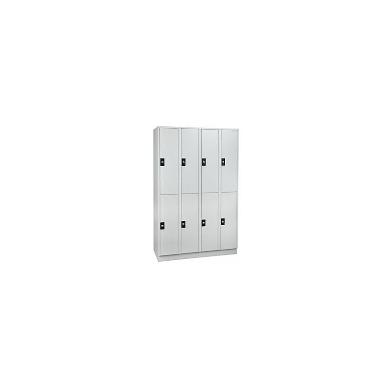 Armadietto guardaroba, 8 scomparti, larghezza 1200 mm, grigio chiaro / grigio chiaro. Fornitura = montato. Altezza = 1800 mm. Profondità = 500 mm. Larghezza = 1200 mm. Colore corpo = grigio chiaro RAL 7035. Colore porta = grigio chiaro RAL 7035. Serratura = serratura a cilindro di sicurezza differenziata. Numero scomparti in larghezza = 4 pz. Numero scomparti = 8 pz. Larghezza scomparti = 300 mm. Materiale = lamiera d'acciaio. Altezza armadietto = 1800 mm. Dotazione interna = 1 asta appendiabiti, 3 ganci. Larghezza interna = 298 mm. Altezza interna = 820 mm. Profondità interna = 475 mm. Tipo di porta = frontalini lisci. Numero chiavi = 2 pz. Altezza scomparti = 820 mm. Larghezza ripiani = 300 mm. Profondità ripiani = 500 mm. Altezza zoccolo = 100 mm. Struttura = saldata. Superficie = con verniciatura a forno. Scomparti interni senza bordi per una facile pulizia. Aerazione mediante fori sulla parete posteriore. Fermi in gomma per una battuta ante silenziosa. Resistente struttura in
