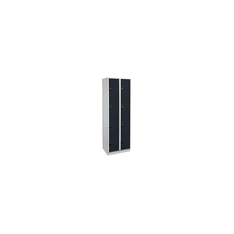 Armadietto a scomparti, 2 vani, 4 scomparti per vano, grigio chiaro / grigio antracite. Fornitura = montato. Altezza = 1800 mm. Profondità = 500 mm. Larghezza = 600 mm. Colore corpo = grigio chiaro RAL 7035. Colore porta = grigio antracite RAL 7016. Serratura = serratura a cilindro di sicurezza differenziata. Numero scomparti in larghezza = 2 pz. Numero scomparti = 8 pz. Larghezza scomparti = 300 mm. Materiale = lamiera d'acciaio. Altezza armadietto = 1800 mm. Dotazione interna = senza dotazione interna. Larghezza interna = 298 mm. Altezza interna = 420 mm. Profondità interna = 475 mm. Tipo di porta = anta a battente. Numero chiavi = 2 pz. Altezza scomparti = 420 mm. Larghezza ripiani = 300 mm. Profondità ripiani = 500 mm. Altezza zoccolo = 100 mm. Struttura = saldata a punti. Superficie = con verniciatura a forno. Facili da pulire grazie agli scomparti interni senza bordi. Aerazione mediante fori sulla parete posteriore. Fermi in gomma per una battuta ante silenziosa. Resistente