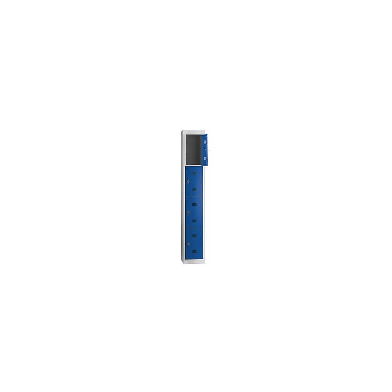 Armadietto in acciaio smontato, anta a battente, 4 vani, altezza 410 mm, larghezza 300 mm, elemento di base, grigio chiaro / blu genziana. Fornitura = smontato. Versione = elemento di base. Altezza = 1800 mm. Profondità = 500 mm. Larghezza = 300 mm. Colore corpo = grigio chiaro RAL 7035. Colore porta = blu genziana RAL 5010. Serratura = chiavistello girevole di sicurezza per lucchetto. Numero scomparti in larghezza = 1 pz. Numero scomparti = 4 pz. Larghezza scomparti = 300 mm. Materiale = acciaio. Altezza armadietto = 1800 mm. Dotazione interna = senza dotazione interna. Larghezza interna = 298 mm. Altezza interna = 410 mm. Profondità interna = 475 mm. Tipo di porta = anta a battente. Altezza zoccolo = 60 mm. Struttura = sistema a innesto. Superficie = con verniciatura a forno. Robusto armadietto con anta a battente. Montaggio a innesto senza viti. Elementi di base e aggiuntivi in varie larghezze e colori. Numero di vani e scomparti a scelta. Aerazione mediante fori sulla parete