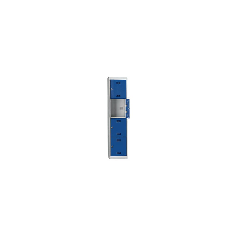Armadietto in acciaio smontato, anta a battente, 4 vani, altezza 410 mm, larghezza 400 mm, elemento di base, grigio chiaro / blu genziana. Fornitura = smontato. Versione = elemento di base. Altezza = 1800 mm. Profondità = 500 mm. Larghezza = 400 mm. Colore corpo = grigio chiaro RAL 7035. Colore porta = blu genziana RAL 5010. Serratura = chiavistello girevole di sicurezza per lucchetto. Numero scomparti in larghezza = 1 pz. Numero scomparti = 4 pz. Larghezza scomparti = 400 mm. Materiale = acciaio. Altezza armadietto = 1800 mm. Dotazione interna = senza dotazione interna. Larghezza interna = 398 mm. Altezza interna = 410 mm. Profondità interna = 475 mm. Tipo di porta = anta a battente. Altezza zoccolo = 60 mm. Struttura = sistema a innesto. Superficie = con verniciatura a forno. Robusto armadietto con anta a battente. Montaggio a innesto senza viti. Elementi di base e aggiuntivi in varie larghezze e colori. Numero di vani e scomparti a scelta. Aerazione mediante fori sulla parete
