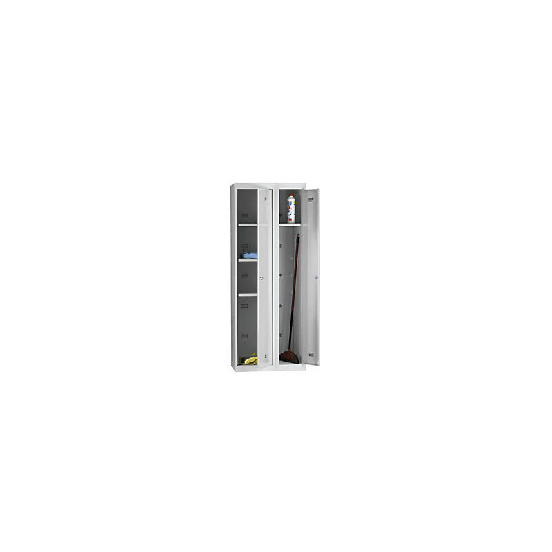 Armadietto in acciaio smontato, anta a battente, 2 scomparti, larghezza totale 700 mm, grigio chiaro / grigio chiaro. Fornitura = smontato. Versione = elemento di base. Altezza = 1800 mm. Profondità = 500 mm. Larghezza = 700 mm. Colore corpo = grigio chiaro RAL 7035. Colore porta = grigio chiaro RAL 7035. Serratura = chiavistello girevole di sicurezza per lucchetto. Numero scomparti in larghezza = 2 pz. Larghezza scomparti = 350 mm. Materiale = acciaio. Altezza armadietto = 1800 mm. Dotazione interna = a sinistra 3 ripiani, a destra 1 ripiano, 2 ganci. Profondità interna = 475 mm. Tipo di porta = anta a battente. Altezza scomparti = 300 / 800 / 250 / 1450 mm. Altezza zoccolo = 60 mm. Struttura = sistema a innesto. Superficie = con verniciatura a forno. Robusto armadietto con anta a battente. Montaggio a innesto senza viti. Elementi di base e aggiuntivi in varie larghezze e colori. Numero di vani e scomparti a scelta. Aerazione mediante fori sulla parete posteriore. Cerniere interne.