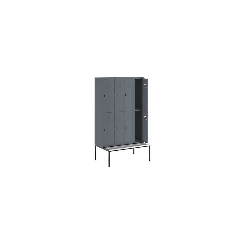 Armadietto guardaroba ad altezza ridotta con panca portante, 300 mm, 8 scomparti, parete piena, grigio-azzurro. Fornitura = montato. Altezza = 2140 mm. Larghezza = 1200 mm. Profondità = 800 mm. Colore corpo = grigioazzurro RAL 7031. Colore porta = grigioazzurro RAL 7031. Serratura = predisposizione per chiusura con lucchetto. Numero scomparti in larghezza = 4 pz. Numero scomparti = 8 pz. Materiale = lamiera d'acciaio, saldata a punti. Larghezza scomparti = 300 mm. Profondità scomparti = 500 mm. Dotazione interna = 1 asta appendiabiti, 3 ganci scorrevoli. Altezza sedile = 400 mm. Profondità sedile = 300 mm. Altezza zoccolo = 50 mm. Altezza armadio = 1750 mm. Profondità armadio = 500 mm. Tipo di porta = ante piene. Colore doghe = grigio. Colore telaio = grigio antracite RAL 7016. Serie = BERLIN. Larghezza interna = 298 mm. Altezza interna = 250 / 1420 mm. Robusta struttura in lamiera d'acciaio saldata a punti. Bordi con doppia profilatura contro il pericolo di lesioni. Ante con