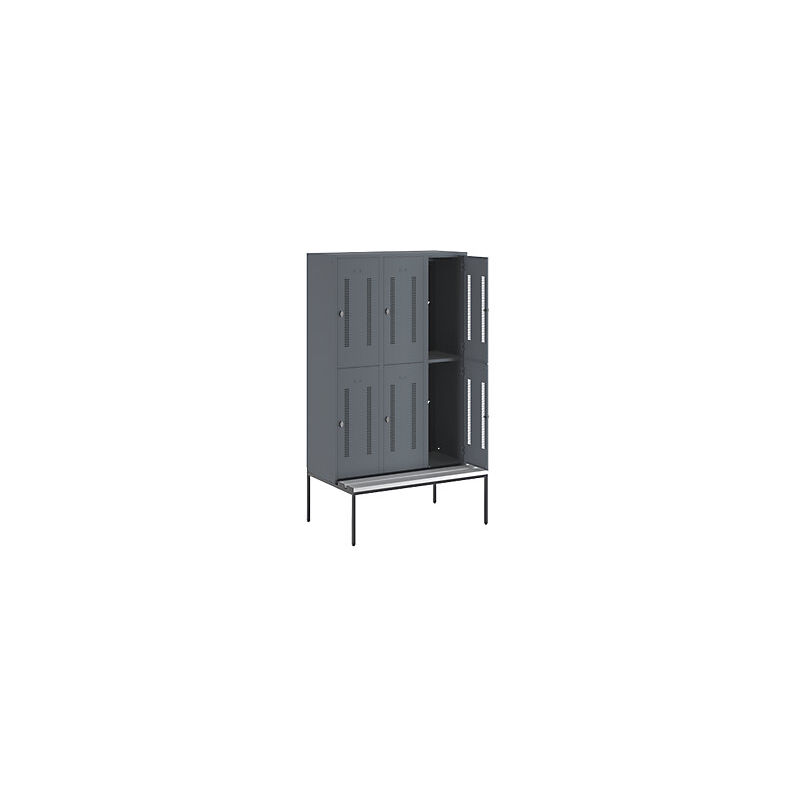 Armadietto guardaroba ad altezza ridotta con panca portante, 400 mm, 6 scomparti, lamiera forata, grigio-azzurro. Fornitura = montato. Altezza = 2140 mm. Larghezza = 1200 mm. Profondità = 800 mm. Colore corpo = grigioazzurro RAL 7031. Colore porta = grigioazzurro RAL 7031. Serratura = predisposizione per chiusura con lucchetto. Numero scomparti in larghezza = 3 pz. Numero scomparti = 6 pz. Materiale = lamiera d'acciaio, saldata a punti. Larghezza scomparti = 400 mm. Profondità scomparti = 500 mm. Dotazione interna = 1 asta appendiabiti, 3 ganci scorrevoli. Altezza sedile = 400 mm. Profondità sedile = 300 mm. Altezza zoccolo = 50 mm. Altezza armadio = 1750 mm. Profondità armadio = 500 mm. Tipo di porta = ante forate. Colore doghe = grigio. Colore telaio = grigio antracite RAL 7016. Serie = BERLIN. Larghezza interna = 398 mm. Altezza interna = 250 / 1420 mm. Robusta struttura in lamiera d'acciaio saldata a punti. Bordi con doppia profilatura contro il pericolo di lesioni. Ante con