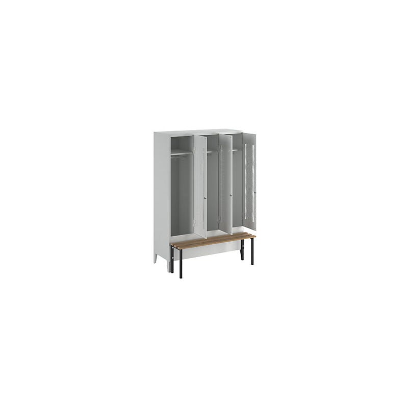 Armadietto guardaroba con panca anteriore, ante in lamiera forata, larghezza scomparti 400 mm, 3 scomparti, grigio chiaro. Fornitura = montato. Altezza = 1850 mm. Larghezza = 1200 mm. Profondità = 805 mm. Colore corpo = grigio chiaro RAL 7035. Colore porta = grigio chiaro RAL 7035. Serratura = chiavistello girevole. Numero scomparti in larghezza = 3 pz. Materiale = lamiera d'acciaio. Larghezza scomparti = 400 mm. Profondità scomparti = 500 mm. Dotazione interna = 1 cappelliera, 1 asta appendiabiti con 4 ganci. Altezza sedile = 415 mm. Profondità sedile = 300 mm. Altezza piedini = 150 mm. Altezza armadio = 1850 mm. Profondità armadio = 500 mm. Tipo di porta = ante forate. Colore doghe = faggio. Colore telaio = nero notte RAL 9005. Serie = BERLIN. Larghezza interna = 398 mm. Altezza interna = 250 / 1420 mm. In robusta lamiera d'acciaio saldata, con rinforzo. Con panca anteriore e ante ridotte. Chiavistello girevole predisposto per lucchetto (diametro staffa 6 - 8 mm max). Portatarghette