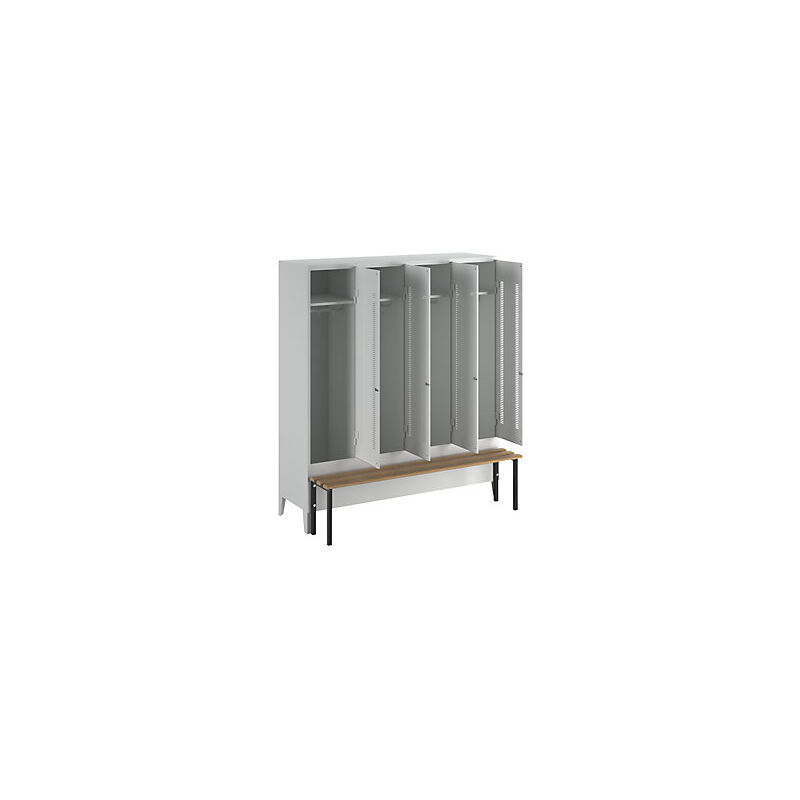 Armadietto guardaroba con panca anteriore, ante in lamiera forata, larghezza scomparti 400 mm, 4 scomparti, grigio chiaro. Fornitura = montato. Altezza = 1850 mm. Larghezza = 1600 mm. Profondità = 805 mm. Colore corpo = grigio chiaro RAL 7035. Colore porta = grigio chiaro RAL 7035. Serratura = chiavistello girevole. Numero scomparti in larghezza = 4 pz. Materiale = lamiera d'acciaio. Larghezza scomparti = 400 mm. Profondità scomparti = 500 mm. Dotazione interna = 1 cappelliera, 1 asta appendiabiti con 4 ganci. Altezza sedile = 415 mm. Profondità sedile = 300 mm. Altezza piedini = 150 mm. Altezza armadio = 1850 mm. Profondità armadio = 500 mm. Tipo di porta = ante forate. Colore doghe = faggio. Colore telaio = nero notte RAL 9005. Serie = BERLIN. Larghezza interna = 398 mm. Altezza interna = 250 / 1420 mm. In robusta lamiera d'acciaio saldata, con rinforzo. Con panca anteriore e ante ridotte. Chiavistello girevole predisposto per lucchetto (diametro staffa 6 - 8 mm max). Portatarghette