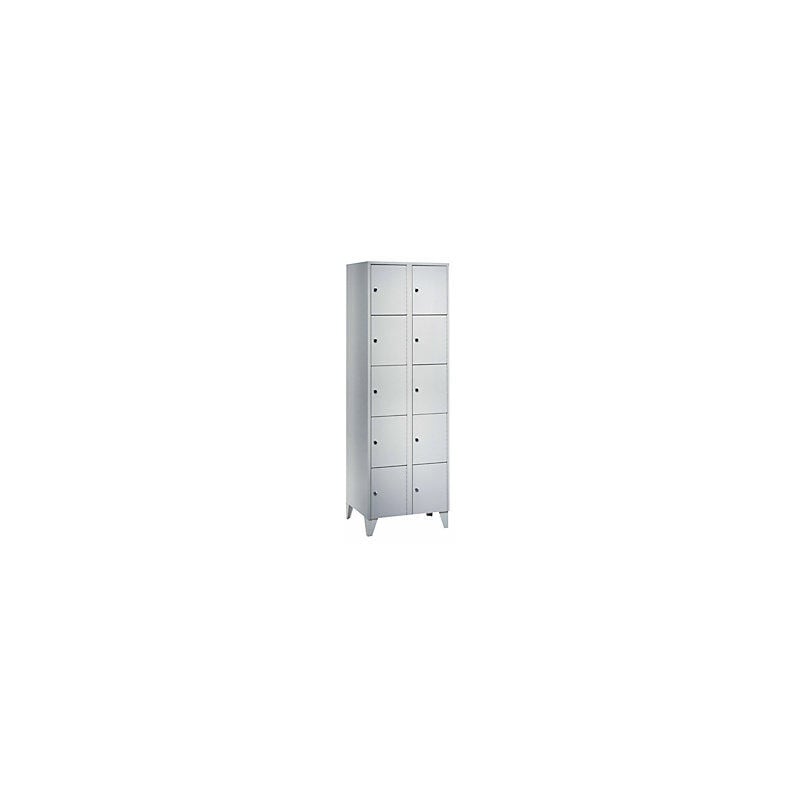 Armadio a scomparti con serratura, con piedini, 10 scomparti, 300 mm, grigio chiaro. Fornitura = montato. Altezza = 1850 mm. Profondità = 500 mm. Larghezza = 600 mm. Colore corpo = grigio chiaro RAL 7035. Colore porta = grigio chiaro RAL 7035. Serratura = serratura a cilindro di sicurezza differenziata. Numero scomparti in larghezza = 2 pz. Numero scomparti = 10 pz. Larghezza scomparti = 300 mm. Materiale = lamiera d'acciaio saldata. Altezza armadietto = 1850 mm. Dotazione interna = senza dotazione interna. Larghezza interna = 298 mm. Altezza interna = 300 mm. Profondità interna = 475 mm. Tipo di porta = ante piene. Numero chiavi = 2 pz. Altezza scomparti = 320 mm. Larghezza ripiani = 300 mm. Profondità ripiani = 500 mm. Altezza piedini = 150 mm. Struttura = saldata. Superficie = con verniciatura a forno. Sfruttamento ottimale dello spazio grazie agli armadietti sovrapposti (vedi Accessori). Con serratura a cilindro. In lamiera d'acciaio saldata. Corpo sempre in grigio chiaro RAL 7035.