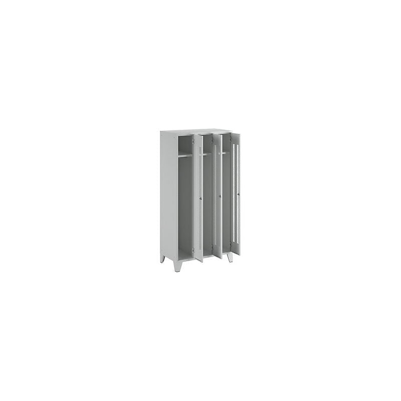 Armadietto in acciaio con piedini, scomparti a tutta altezza, ante forate, larghezza scomparto 300 mm, 3 scomparti, grigio chiaro. Fornitura = montato. Altezza = 1850 mm. Profondità = 500 mm. Larghezza = 900 mm. Colore corpo = grigio chiaro RAL 7035. Colore porta = grigio chiaro RAL 7035. Serratura = chiavistello girevole. Numero scomparti in larghezza = 3 pz. Larghezza scomparti = 300 mm. Materiale = lamiera d'acciaio. Altezza armadietto = 1850 mm. Dotazione interna = 1 cappelliera, 1 asta appendiabiti, 3 ganci scorrevoli. Larghezza interna = 298 mm. Altezza interna = 300 / 1400 mm. Profondità interna = 475 mm. Tipo di porta = ante forate. Altezza piedini = 150 mm. Struttura = saldata. Superficie = con verniciatura a forno. Robusto armadietto con piedini a norma DIN 4547. Disponibili in varie larghezze e colori. A scelta con ante forate o piene con battuta a destra. Dotazione interna personalizzabile. Fessure di aerazione per una circolazione ottimale dell'aria. Bordo con doppia