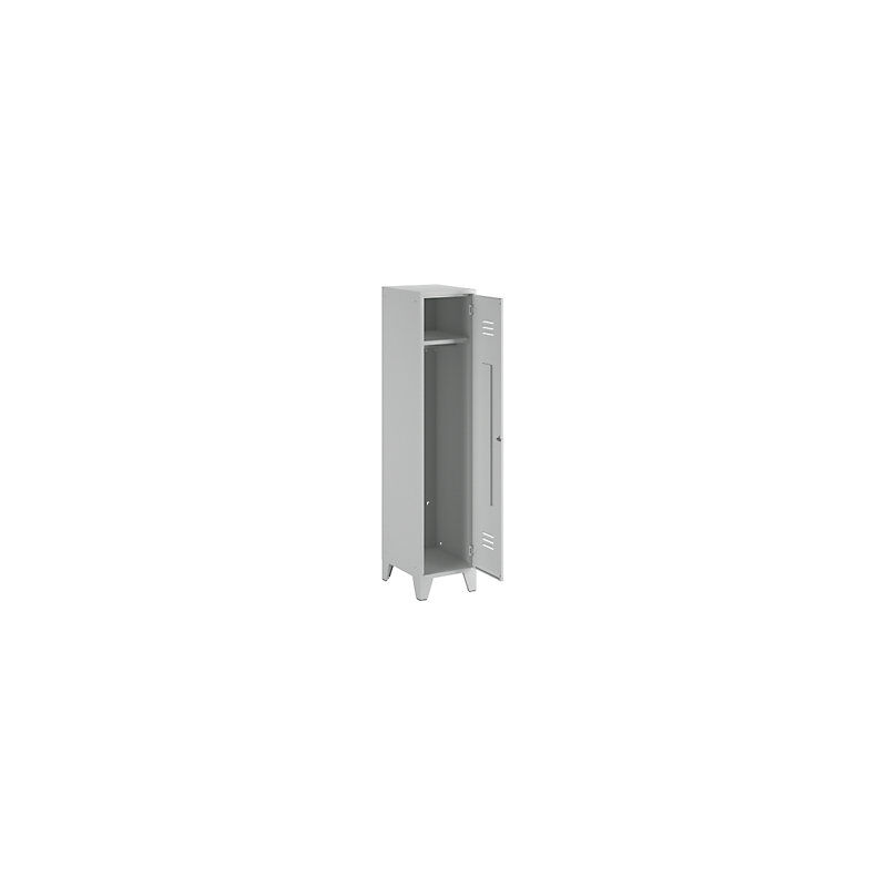 Armadietto in acciaio con piedini, scomparti a tutta altezza, ante piene, larghezza scomparto 400 mm, 1 scomparto, grigio chiaro. Fornitura = montato. Altezza = 1850 mm. Profondità = 500 mm. Larghezza = 400 mm. Colore corpo = grigio chiaro RAL 7035. Colore porta = grigio chiaro RAL 7035. Serratura = chiavistello girevole. Numero scomparti in larghezza = 1 pz. Larghezza scomparti = 400 mm. Materiale = lamiera d'acciaio. Altezza armadietto = 1850 mm. Dotazione interna = 1 cappelliera, 1 asta appendiabiti, 4 ganci scorrevoli. Larghezza interna = 398 mm. Altezza interna = 300 / 1400 mm. Profondità interna = 475 mm. Tipo di porta = ante piene. Altezza piedini = 150 mm. Struttura = saldata. Superficie = con verniciatura a forno. Robusto armadietto con piedini a norma DIN 4547. Disponibili in varie larghezze e colori. A scelta con ante forate o piene con battuta a destra. Dotazione interna personalizzabile. Fessure di aerazione per una circolazione ottimale dell'aria. Bordo con doppia