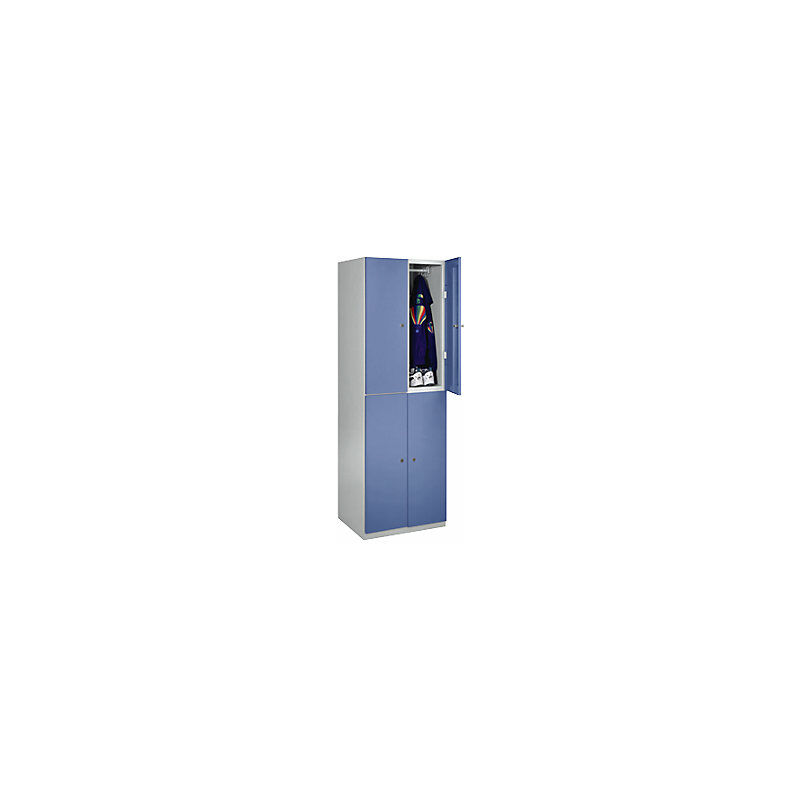 Armadio a scomparti, 4 scomparti, 1800 x 600 x 500 mm, ante blu colomba. Fornitura = montato. Altezza = 1800 mm. Profondità = 500 mm. Larghezza = 600 mm. Colore corpo = grigio chiaro RAL 7035. Colore porta = blu colomba RAL 5014. Serratura = serratura a cilindro differenziata. Numero scomparti in larghezza = 2 pz. Numero scomparti = 4 pz. Larghezza scomparti = 300 mm. Materiale = lamiera d'acciaio saldata. Altezza armadietto = 1800 mm. Dotazione interna = 1 asta appendiabiti, 3 ganci scorrevoli. Larghezza interna = 298 mm. Altezza interna = 850 mm. Profondità interna = 475 mm. Tipo di porta = ante piene. Numero chiavi = 2 pz. Altezza scomparti = 850 mm. Larghezza ripiani = 300 mm. Profondità ripiani = 500 mm. Altezza zoccolo = 100 mm. Struttura = saldata a punti. Superficie = con verniciatura a forno. Cerniere interne. Battuta silenziosa. Aerazione mediante fori sulla parete posteriore. Robusta struttura in lamiera d'acciaio saldata. Verniciatura a fuoco, corpo sempre in grigio chiaro