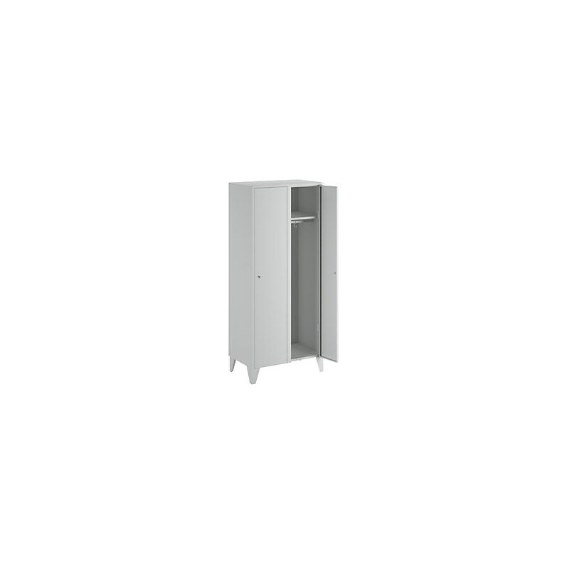 Armadio guardaroba con piedini, alt. x largh. x prof. 1850 x 800 x 500 mm, 2 scomparti, grigio chiaro. Fornitura = montato. Altezza = 1850 mm. Profondità = 500 mm. Larghezza = 800 mm. Colore corpo = grigio chiaro RAL 7035. Colore porta = grigio chiaro RAL 7035. Serratura = serratura a cilindro di sicurezza differenziata. Numero scomparti in larghezza = 2 pz. Larghezza scomparti = 400 mm. Materiale = lamiera d'acciaio saldata. Altezza armadietto = 1850 mm. Dotazione interna = 1 cappelliera, 1 asta appendiabiti con 3 ganci scorrevoli. Larghezza interna = 398 mm. Altezza interna = 250 / 1400 mm. Profondità interna = 475 mm. Tipo di porta = ante piene. Numero chiavi = 2 pz. Altezza scomparti = 1700 mm. Larghezza ripiani = 400 mm. Profondità ripiani = 500 mm. Altezza piedini = 150 mm. Struttura = saldata a punti. Superficie = con verniciatura a forno. Sfruttamento ottimale dello spazio grazie agli armadietti sovrapponibili. Con serratura a cilindro. In lamiera d'acciaio saldata. Corpo