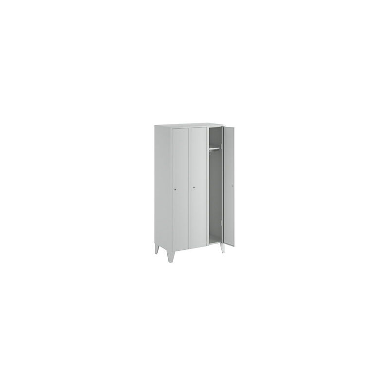 Armadio guardaroba con piedini, alt. x largh. x prof. 1850 x 900 x 500 mm, 3 scomparti, grigio chiaro. Fornitura = montato. Altezza = 1850 mm. Profondità = 500 mm. Larghezza = 900 mm. Colore corpo = grigio chiaro RAL 7035. Colore porta = grigio chiaro RAL 7035. Serratura = serratura a cilindro di sicurezza differenziata. Numero scomparti in larghezza = 3 pz. Larghezza scomparti = 300 mm. Materiale = lamiera d'acciaio saldata. Altezza armadietto = 1850 mm. Dotazione interna = 1 cappelliera, 1 asta appendiabiti con 3 ganci scorrevoli. Larghezza interna = 298 mm. Altezza interna = 250 / 1400 mm. Profondità interna = 475 mm. Tipo di porta = ante piene. Numero chiavi = 2 pz. Altezza scomparti = 1700 mm. Larghezza ripiani = 300 mm. Profondità ripiani = 500 mm. Altezza piedini = 150 mm. Struttura = saldata a punti. Superficie = con verniciatura a forno. Sfruttamento ottimale dello spazio grazie agli armadietti sovrapponibili. Con serratura a cilindro. In lamiera d'acciaio saldata. Corpo