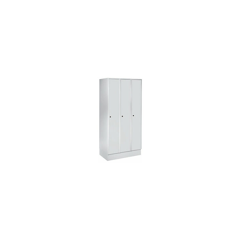 Armadietto guardaroba con zoccolino, alt. x largh. x prof. 1800 x 900 x 500 mm, 3 scomparti, grigio chiaro. Fornitura = montato. Altezza = 1800 mm. Profondità = 500 mm. Larghezza = 900 mm. Colore corpo = grigio chiaro RAL 7035. Colore porta = grigio chiaro RAL 7035. Serratura = serratura a cilindro di sicurezza differenziata. Numero scomparti in larghezza = 3 pz. Larghezza scomparti = 300 mm. Materiale = lamiera d'acciaio saldata. Altezza armadietto = 1800 mm. Dotazione interna = 1 cappelliera, 1 asta appendiabiti con 3 ganci scorrevoli. Larghezza interna = 298 mm. Altezza interna = 250 / 1400 mm. Profondità interna = 475 mm. Tipo di porta = ante piene. Numero chiavi = 2 pz. Altezza zoccolo = 100 mm. Struttura = saldata a punti. Superficie = con verniciatura a forno. Sfruttamento ottimale dello spazio grazie agli armadietti sovrapponibili. Con serratura a cilindro. Varianti di dotazione in base alle esigenze. In lamiera d'acciaio saldata. Corpo sempre in grigio chiaro RAL 7035. Facili