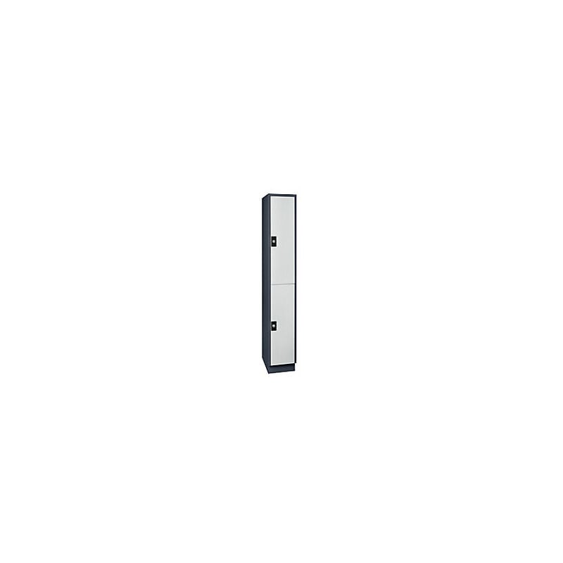 Armadietto guardaroba, 2 scomparti, larghezza 300 mm, grigio antracite / grigio chiaro. Fornitura = montato. Altezza = 1800 mm. Profondità = 500 mm. Larghezza = 300 mm. Colore corpo = grigio antracite RAL 7016. Colore porta = grigio chiaro RAL 7035. Serratura = serratura a cilindro di sicurezza differenziata. Numero scomparti in larghezza = 1 pz. Numero scomparti = 2 pz. Larghezza scomparti = 300 mm. Materiale = lamiera d'acciaio. Altezza armadietto = 1800 mm. Dotazione interna = 1 asta appendiabiti, 3 ganci. Larghezza interna = 298 mm. Altezza interna = 820 mm. Profondità interna = 475 mm. Tipo di porta = frontalini lisci. Numero chiavi = 2 pz. Altezza scomparti = 820 mm. Larghezza ripiani = 300 mm. Profondità ripiani = 500 mm. Altezza zoccolo = 100 mm. Struttura = saldata. Superficie = con verniciatura a forno. Scomparti interni senza bordi per una facile pulizia. Aerazione mediante fori sulla parete posteriore. Fermi in gomma per una battuta ante silenziosa. Resistente struttura in